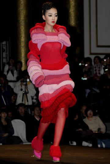 浙江理工大學(xué)2009屆畢業(yè)生設(shè)計(jì)作品發(fā)布會(huì)上展示的學(xué)生作品。 受國際金融危機(jī)影響,東京時(shí)裝周直接宣布取消活動(dòng),紐約、倫敦、米蘭等地的秋冬時(shí)裝周也縮減規(guī)模,而在北京舉行的中國國際時(shí)裝周則基本保持穩(wěn)定。一周時(shí)間里舉辦近40項(xiàng)專業(yè)活動(dòng)。在這近40項(xiàng)專業(yè)活動(dòng)中,關(guān)于學(xué)生作品的活動(dòng)占到1/3,成為本屆時(shí)裝周的亮點(diǎn)。 |