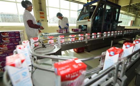 記者從近日召開的新疆穩(wěn)定奶業(yè)發(fā)展工作會議上獲悉,新疆決定2009年新安排8010萬元財政資金,重點用于推進學(xué)生飲用奶計劃,實施乳品企業(yè)原料奶收購貸款貼息、奶粉儲備補助、乳品外銷儲運補貼。據(jù)了解,2008年10月以來,受國際金融危機和三鹿奶粉事件影響,新疆乳品企業(yè)積壓奶粉一度達到6000多噸。圖為新疆麥趣爾乳業(yè)有限公司包裝車間內(nèi),工人將生產(chǎn)出的袋裝奶裝箱。