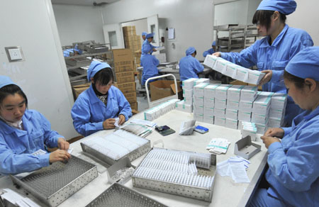 近年,蘇州市吳中區(qū)致力于打造“中國(guó)蘇州吳中藥港”。目前吳中醫(yī)藥產(chǎn)業(yè)基地已成為全國(guó)規(guī)模最大的OTC營(yíng)養(yǎng)補(bǔ)充劑生產(chǎn)基地、最大的第三代頭孢類抗生素原料藥及中間體供應(yīng)基地。圖為蘇州長(zhǎng)征-欣凱制藥有限公司工人在包裝藥品。