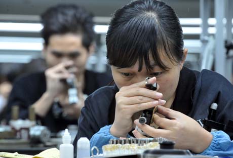 廣州市番禺區(qū)的400多家珠寶玉石企業(yè)為應(yīng)對(duì)金融危機(jī)給出口帶來的沖擊,積極開拓國(guó)內(nèi)市場(chǎng)。2008年,番禺珠寶外銷總額13億美元,同比增長(zhǎng)6.47%,而內(nèi)銷同比增長(zhǎng)70%。圖為廣州番禺珠寶產(chǎn)業(yè)發(fā)展中心一家珠寶企業(yè)的員工在車間工作。