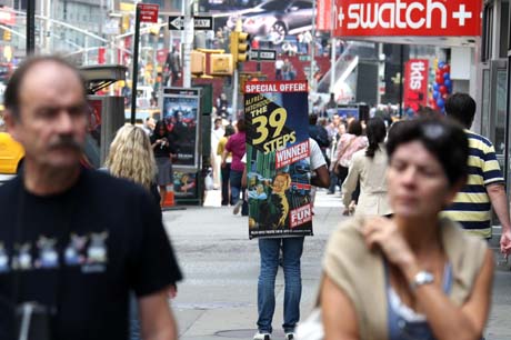 在美國紐約百老匯大道上有這樣一群人,胸前和身后各背著一塊廣告看板,自己的身子夾在兩塊看板中間,一邊向路人發(fā)放百老匯最新劇目的宣傳單,一邊嘴里還不停地宣傳劇目——人們給了他們一個很形象的稱呼“夾心廣告”。自經(jīng)濟不景氣以來,百老匯的“夾心廣告”也越來越多了。 圖為一名“夾心廣告”站在美國紐約百老匯大道上。