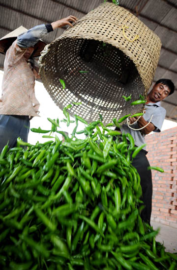 5月14日,欽州市那麗鎮(zhèn)農(nóng)民在幫助收購商儲放辣椒。 2008年以來,廣西欽州市農(nóng)民大力發(fā)展“避雨、避寒、避曬”的“三避”技術(shù)栽培辣椒獲得成功。今年種植的七萬多畝辣椒,預(yù)計產(chǎn)量達(dá)11萬噸,產(chǎn)值近三億元。目前已收獲的辣椒正通過各種途徑銷往全國各地。