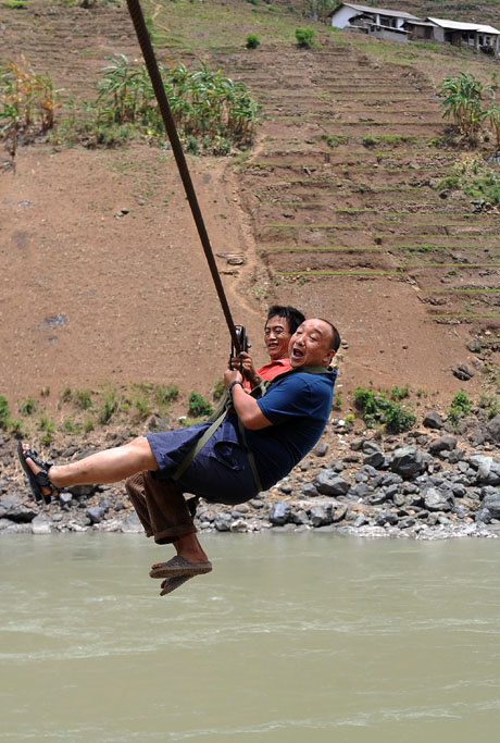 5月24日,一名游客(前)在當(dāng)?shù)厝罕姷呐惆橄略谠颇鲜∨圩遄灾沃轂o水縣境內(nèi)的怒江河谷溜索。 溜索是怒江河谷最具代表性的原始交通工具之一,曾經(jīng)是當(dāng)?shù)厝罕娺^江的主要方式。如今橫架在怒江上的橋越來越多,但溜索仍然沒有退出歷史舞臺。除在一些偏遠(yuǎn)的高山峽谷地帶,溜索作為交通工具仍然在使用外,現(xiàn)在怒江溜索已經(jīng)成為一種新興旅游項目,越來越多的海內(nèi)外游客來到怒江都要體驗溜索這種“勇敢者的運(yùn)動”,感受凌空飛溜的驚險與刺激。 |