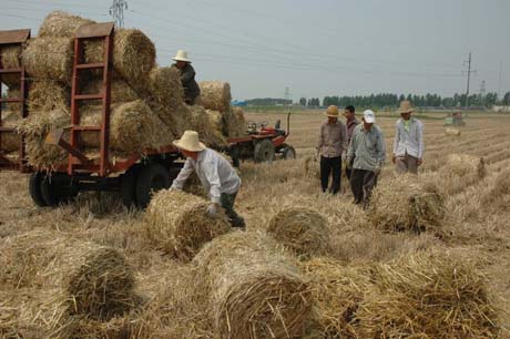 6月2日,在河南省社旗縣城郊鄉(xiāng)柳營村,秸稈打捆作業(yè)隊將秸稈打捆回收。 為遏制焚燒秸稈,畜牧養(yǎng)殖大縣社旗縣組織數(shù)十臺秸稈打捆機械,活躍在田間地頭,將秸稈捆扎回收。秸稈可以成為牛羊飼料,變廢為寶。僅此一項,每畝地可為農(nóng)民增收40余元。
