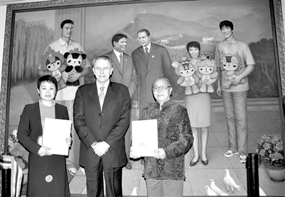 6月12日,來(lái)自中國(guó)北京橋藝術(shù)中心的畫(huà)家王尊五將巨幅北京奧運(yùn)會(huì)紀(jì)念性油畫(huà)《奧運(yùn)暢想》轉(zhuǎn)交國(guó)際奧委會(huì)主席雅克·羅格,為奧林匹克博物館的永久性藏品再添重彩。畫(huà)作中央是北京奧組委主席劉淇和國(guó)際奧委會(huì)主席羅格在親切交談,他們的身旁,是手捧北京奧運(yùn)會(huì)吉祥物福娃的中國(guó)著名運(yùn)動(dòng)員姚明、鄧亞萍和劉翔。圖為國(guó)際奧委會(huì)主席羅格(中)與中國(guó)畫(huà)家王尊五(右)在畫(huà)作前合影