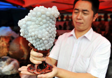 7月10日,一名奇石收藏者在展示葡萄瑪瑙石。 當(dāng)日,第七屆中國·銀川賞石旅游節(jié)在銀川文化城開幕。來自內(nèi)蒙古、山東等地的眾多奇石收藏者展出上萬件材質(zhì)、形狀各異的奇石,讓參觀者大開眼界。