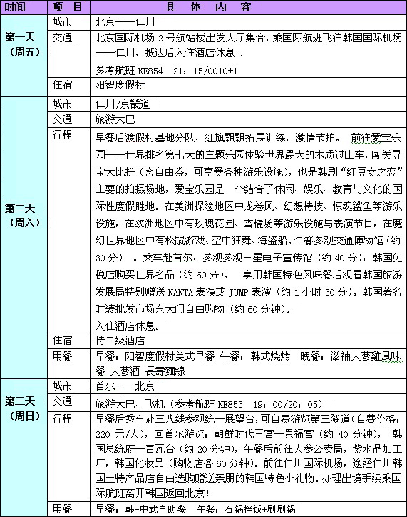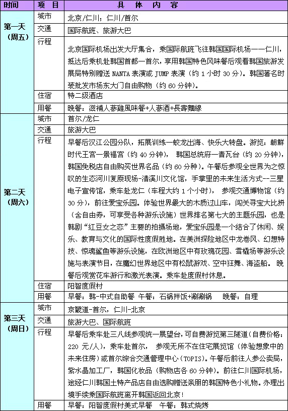 行程報價:2880元/人,憑華聲在線王建五的博客優(yōu)惠券:(http://wangjianwu.blog.voc.com.cn)每人可優(yōu)惠300元,售價僅為2580元/人。 費用包含以下內(nèi)容:韓國全程特二級酒店以上標準或韓式渡假村/房間2人1間/1日3餐/全程華語導(dǎo)游;包含國際及境外交通費/全程機場稅/第一景點門票/簽證費/旅行社責任險;全程活動拓展組織費。 不含護照費/國內(nèi)交通費/個人消費/小費(30元/人天),自費項目和旅游意外傷害保險。
