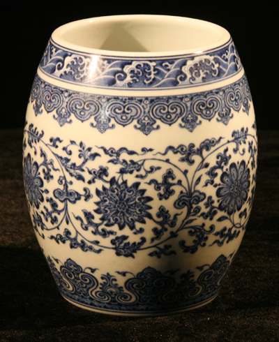 隨著2009年CCTV大型電視活動(dòng)“華邦國(guó)際杯”《尋寶———走進(jìn)鹽城》活動(dòng)的圓滿結(jié)束,“清乾隆青花纏枝鼓式缸”(如圖)以絕對(duì)的優(yōu)勢(shì)毫無(wú)懸念地入圍了鹽城十大民間寶物。該藏品系陳設(shè)觀賞器,品相完好,器形端正,造型工整,花紋精細(xì),技法老練,一看便知出自官窯手筆,再者,其白釉底色略含青灰,為清乾隆瓷器的典型色,純正厚實(shí),沉郁幽靚,歷經(jīng)百年,浮光依稀,溫文爾雅,堪得林下耆英之風(fēng)。