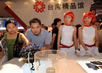 9月9日,正在福建廈門(mén)舉行的第十三屆中國(guó)國(guó)際投資貿(mào)易洽談會(huì)上,觀眾在臺(tái)灣精品館觀看臺(tái)灣制造的富有創(chuàng)意的自行車(chē)帽。新華社記者:張國(guó)俊