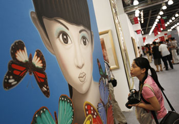 9月9日,2009上海藝術(shù)博覽會(huì)在上海世貿(mào)商城開幕。本屆博覽會(huì)展示面積達(dá)到2.4萬平方米,來自美國、法國、德國、韓國、日本等10多個(gè)國家的120多家海內(nèi)外畫廊和機(jī)構(gòu)在藝博會(huì)上集中展示了各類題材的國畫、油畫、雕塑、攝影、裝置藝術(shù)等作品。新華社記者