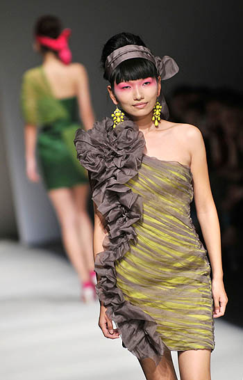 2009上海時裝周2010春夏作品發(fā)布日前舉行,各大品牌的時裝發(fā)布會繽紛上演,給觀眾帶來了新鮮時髦的視覺享受。 圖為模特在JudyHua春夏作品發(fā)布會現(xiàn)場展示時裝。
