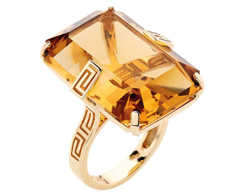 ▲范思哲的DAFNE指環(huán)系列采用了紅金、黃金及白金等不同材質(zhì),綴飾深色紫晶及灼爍石英。寶石的琢面獨特而耀目,配合以精工細(xì)造的希臘萬字圖案,成就了完美的鏤嵌效果。