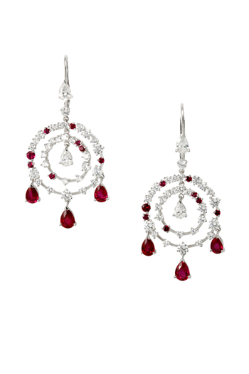 圖為Pétillante針式耳環(huán),以兩個(gè)同心寶石圈拼湊出精致造型,一顆炫目的梨形鉆石被無數(shù)碎鉆和不同色調(diào)的紅寶石環(huán)繞著。