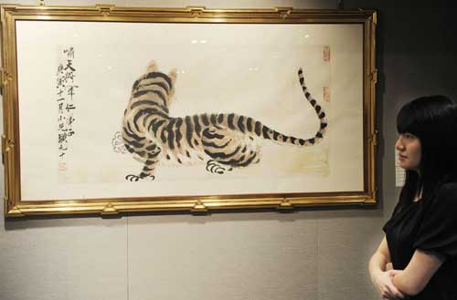 4月6日,香港蘇富比將在香港會(huì)展中心舉辦2010年中國(guó)書畫春季拍賣會(huì)。本次中國(guó)書畫拍賣匯集了齊白石及張大千等十九、二十世紀(jì)名家佳作,以及知名收藏及鑒賞家張宗憲先生的部分珍藏,共計(jì)260件拍品,預(yù)計(jì)總估價(jià)超過2億港元。 圖為齊白石1950年作品《虎》,估價(jià)2800萬港元。