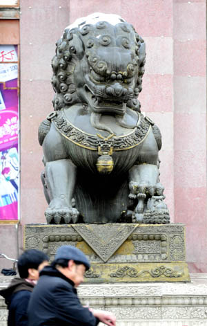 擺放在沈陽中街附近的一對巨型“中華銅獅”近日將在沈陽拍賣。這對銅獅一雄一雌,每個高度都在3.03米,共用15噸黃銅,采用國際上最先進(jìn)的整體澆鑄技術(shù)完成。據(jù)“中華銅獅”擁有者張家志介紹,這對銅獅由近百位能工巧匠歷時6年于2006年鑄造完成,近日決定拍賣,起拍價300萬元。