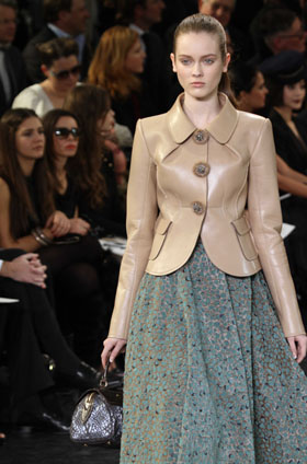 路易威登這一季舉起復(fù)古大旗,“閃回”過(guò)去,再現(xiàn)上世紀(jì)50年代女性的風(fēng)姿。 由著名設(shè)計(jì)師馬克·雅各布斯主理的路易威登2010—2011秋冬時(shí)裝以連衣長(zhǎng)裙為主。各式花色裙裝均采用收腰設(shè)計(jì),而裙擺處則采用開(kāi)放式設(shè)計(jì),仿佛一朵朵鮮花在模特身上綻放。此外,設(shè)計(jì)師在長(zhǎng)裙上身部分的精心設(shè)計(jì),突出了女性的豐滿、盈潤(rùn)。 箱包是路易威登秀臺(tái)上永遠(yuǎn)不可缺少的配飾。一款款精致手包恰到好處地為一套套服飾增加色彩,無(wú)形之中也深化了品牌形象。
