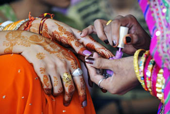 印度女性結(jié)婚前,要隆重舉行多種儀式。其中,紋圖儀式就是頗為重要的一環(huán),主要由新娘家族成員或朋友參加。在印度,不同地區(qū)有著不同的新娘紋圖儀式。 薩羅杰教授介紹說(shuō),新娘紋圖儀式一般選擇婚禮前夕或幾天前在宴會(huì)廳或其他地方舉行。紋圖儀式開(kāi)始后,設(shè)計(jì)師或新娘的親戚和家庭成員就會(huì)開(kāi)始在新娘手上紋圖。在印度一些地方,如果新娘的第一個(gè)基本圖案由母親親手繪制,則意味著吉祥。新娘紋圖期間,參加儀式的婦女們會(huì)唱著傳統(tǒng)歌曲,跳著傳統(tǒng)舞蹈,如同過(guò)節(jié)一般慶賀。 紋圖是件頗為“藝術(shù)”的事。上乘的紋圖需要幾個(gè)小時(shí),甚至一、兩天時(shí)間。為了讓圖案保持長(zhǎng)久,一般要在圖案上涂抹糖和檸檬汁。圖案紋好后,還要抹上丁香油,自然晾干數(shù)個(gè)小時(shí),才能保持鮮亮的顏色。這樣的紋圖多能保持幾周,甚至幾個(gè)月的時(shí)間。印度傳統(tǒng)文化思想認(rèn)為,新娘的紋圖保留時(shí)間越長(zhǎng),未來(lái)的日子越吉祥。當(dāng)然,這樣的紋圖要價(jià)很高,需要1萬(wàn)盧比(1美元約合46盧比),甚至更多。 紋圖一般紋在手上,也有紋在腳上的。此外,人體其他容易展示美的部位也在選擇之列,包括背部和上腹部等。在手上紋圖時(shí),可選擇手掌、手背、手指和手腕等部位。足部紋圖則包括腳背以及腳腕等。新娘紋圖一般選擇大家喜歡的植物,包括一些樹(shù)的樹(shù)葉和花等。 紋圖對(duì)顏色的選用也很有講究,一般運(yùn)用黑色或棕黃色。薩羅杰說(shuō),在印度西北部的拉賈斯坦邦,許多新娘喜歡黑色;在孟買(mǎi),許多新娘選擇棕黃色。不僅如此,印度新娘對(duì)顏色的深淺也有特殊的要求。傳統(tǒng)思想認(rèn)為,紋圖的顏色越深,意味著新郎對(duì)新娘的愛(ài)將越深。 在一些地區(qū)“有心計(jì)”的新娘會(huì)在紋圖上暗設(shè)種種“機(jī)關(guān)”,以考察新婚的夫君。比如,有的新娘會(huì)把新郎的名字暗藏在紋圖里。新娘看到新郎后,要求新郎在一定時(shí)間內(nèi)從紋圖中迅速找出自己的名字,以考驗(yàn)新郎是否有好的眼力和靈活頭腦。然而,這是很艱難的“識(shí)別”任務(wù)。圖案樹(shù)葉密密麻麻,字母也很小。如果考試合格,新郎將給新娘留下一個(gè)很好的印象。如果新郎遲遲找不到自己的名字,一些喜歡捉弄人的新娘就會(huì)趁機(jī)把新郎數(shù)落一番,要求新郎在屋內(nèi)罰跑幾圈,給他一個(gè)“下馬威”。