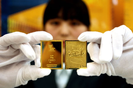 為紀(jì)念中國(guó)2010年上海世博會(huì)開幕,中國(guó)郵政發(fā)行《中國(guó)2010年上海世博會(huì)開幕紀(jì)念》郵票一套一枚,日前,中國(guó)集郵總公司以開幕郵票圖案特別制作發(fā)行《〈中國(guó)2010年上海世博會(huì)開幕紀(jì)念〉郵票金磚》一組三款。這是繼中國(guó)郵政發(fā)行《〈開國(guó)大典〉郵票金磚》及《〈庚寅年〉郵票金磚》之后第三組編號(hào)限量發(fā)行的郵票金磚。 |