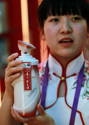 作為中國2010年上海世博會惟一指定白酒,國酒茅臺在世博園內(nèi)推出根據(jù)各國家自建館的建筑風(fēng)格設(shè)計的限量紀(jì)念版“世博喜酒”。新華社記者 任瓏/攝 |