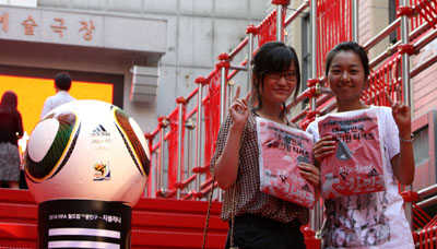 韓國(guó)到處可見世界杯相關(guān)宣傳,世界杯氣氛日漸濃郁。韓國(guó)首爾著名商業(yè)街明洞日前還舉行抽獎(jiǎng)?lì)I(lǐng)韓國(guó)國(guó)家隊(duì)隊(duì)服活動(dòng),圖為兩個(gè)女孩展示領(lǐng)到的韓國(guó)國(guó)家隊(duì)隊(duì)服,興奮之情溢于言表。記者 何璐璐/首爾報(bào)道
