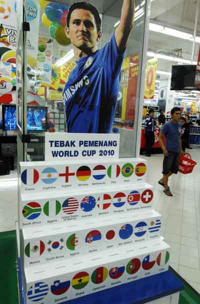 為迎接2010年南非世界杯,印度尼西亞首都雅加達(dá)眾多商場(chǎng)內(nèi)的體育用品店打出“世界杯”經(jīng)濟(jì)牌,吸引球迷購(gòu)買有關(guān)足球的用品。圖為雅加達(dá)一家商場(chǎng)內(nèi),一名顧客從競(jìng)猜世界杯冠軍的投票箱旁經(jīng)過。記者 岳月偉/雅加達(dá)報(bào)道