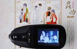 該套郵票是我國首套集音頻、視頻于一體的高科技多媒體郵票,兼具欣賞和收藏價值。郵票采用三層制版印刷技術,票面上印有人物、建筑和多媒體視頻編碼,畫面極具層次感。用專用的視頻點讀筆點讀郵票內容,可聽到清麗悠遠的昆曲唱腔,并能觀看到美輪美奐的身段表演。
