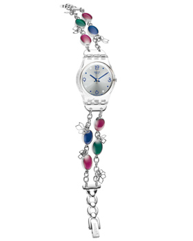 斯沃琪月光寶石·浪漫名媛淑女腕表(LadyMaona)的表鏈繼承了斯沃琪Bjioux的色彩和繁花圖案,采用拋光不銹鋼316L制造,由略呈拱形的橢圓團(tuán)花構(gòu)成,飾以彩色半透明合成樹脂。橢圓團(tuán)花與優(yōu)美的花卉吊飾從鏈條上垂掛而下,通往透明的塑料表殼。優(yōu)雅的設(shè)計凸顯了腕表的精致與名媛氣質(zhì)。