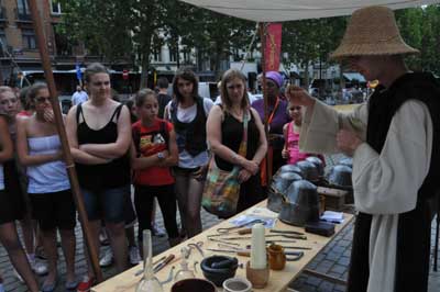 6月30日,一些學(xué)生在比利時首都布魯塞爾街頭觀看古代郎中和他的器具。當(dāng)天,布魯塞爾情景再現(xiàn)歐洲中世紀(jì)的世俗生活,以獨(dú)特方式慶祝比利時即將擔(dān)任歐盟輪值主席,并迎接暑假的到來。