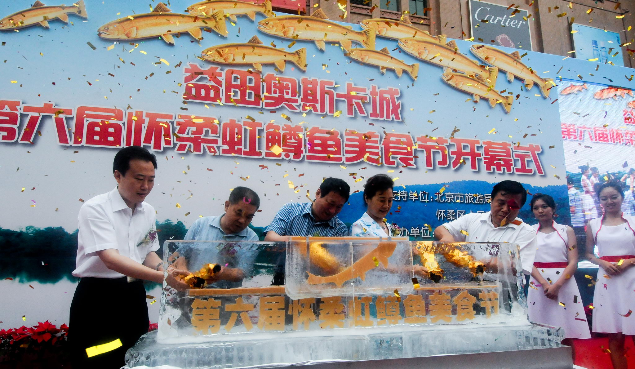 2010年7月13日,在北京王府井大街舉辦的懷柔區(qū)第六屆虹鱒魚美食節(jié)開(kāi)幕式上,嘉賓將酒注入冰塊中。據(jù)介紹,本屆虹鱒魚美食節(jié)以“相約生態(tài)懷柔,共享虹鱒盛宴”為主題,共有17項(xiàng)活動(dòng)將陸續(xù)推出。