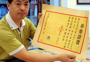 遼寧省沈陽市民間收藏家詹洪閣近日展出了十多年來收藏的各類畢業(yè)證多達(dá)千件,其中最早的可追溯到清末宣統(tǒng)二年(1910年)。這些畢業(yè)證大小不一、形式各異,叫法也不盡相同,卻是中國百年教育史的縮影。 這些畢業(yè)證名稱并不統(tǒng)一。有的名為“卒業(yè)證”,有的名為“休業(yè)證”,有的叫做“修了證”。據(jù)詹洪閣統(tǒng)計(jì),名稱多達(dá)10余種。 年代最為久遠(yuǎn)的是一張清末師范學(xué)堂頒發(fā)的“修業(yè)文憑”,距今整整100年。這張文憑不僅詳細(xì)記載了學(xué)生姓名、籍貫和12門功課的成績,而且學(xué)生祖上三輩“曾祖、祖父、父親”姓名都記錄在冊。 每張畢業(yè)證都有著時(shí)代的烙印。民國時(shí)期的畢業(yè)證大都印有“青天白日滿地紅”旗幟,偽滿洲國時(shí)期東北一些學(xué)校所發(fā)畢業(yè)證還印有龍紋;新中國成立后,畢業(yè)證上印上了紅旗、國旗或是毛澤東像,有的則印著“為人民服務(wù)“救死扶傷,實(shí)行革命的人道主義”等字樣。 由于畢業(yè)證上大都留有校長的親筆簽名,因此這些證書也成為老教育家執(zhí)教經(jīng)歷的見證。北京大學(xué)1954年頒發(fā)給學(xué)生高振斌的畢業(yè)證上,校長留名是著名人口學(xué)家馬寅初;民國期間國立政治大學(xué)頒發(fā)的一張畢業(yè)證,學(xué)者顧毓琇的名字寫在證書上;華北大學(xué)的一張畢業(yè)證上,校長是吳玉章,副校長是成仿吾和范文瀾。 在詹洪閣收藏的畢業(yè)證中,學(xué)歷高可達(dá)大學(xué)、碩士,低可為學(xué)前甚至掃盲。上海市新成區(qū)中心小學(xué)發(fā)給7歲的馮阿鳳的就是一張“保育證書”,上面寫著“在小學(xué)附設(shè)幼兒園保育期滿,特發(fā)此證”。還有一張是1955年發(fā)給一名30歲婦女的“識字證書”,恰是新中國成立后各地掀起掃盲識字活動的真實(shí)記錄。 |