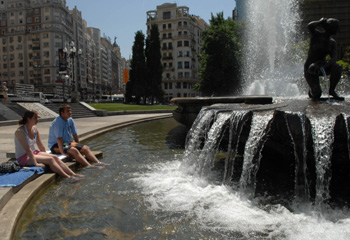 受內(nèi)地大陸性氣候影響,西班牙大部分地區(qū)夏季日照時間長,氣候炎熱,有時氣溫高達38攝氏度。為防暑降溫,西班牙許多公共場所安裝了類似溫室里的一種噴霧裝置,為酷熱盛夏里的人們帶來一份舒適和愜意。 這種裝置分電風(fēng)扇噴霧和管道噴霧兩款,在首都馬德里的地鐵站、露天餐館、酒吧和街道上都能看到。馬德里北部桑切斯·羅梅羅商業(yè)中心有一家西班牙地方特色菜餐館。餐廳分室內(nèi)和室外兩部分,室內(nèi)有空調(diào),室外的露天平臺上就安裝著噴霧降溫裝置。 數(shù)百平方米的二層露天平臺上擺放了約50張餐桌,餐桌上方約兩米高的地方平行安裝了三行像細水管一樣的裝置,水管上每隔十余厘米就有一個小孔,每隔幾分鐘就從中噴出霧氣,有時略帶一些小水珠。霧氣能噴到一米多遠的地方,覆蓋了整個露天餐廳。西班牙的自來水可直接飲用,所以用餐者不會在意噴出的霧水落在餐桌或身上,而是感到一種“由天而降”的涼爽和愜意。 馬德里市中心美術(shù)館樓下的露天咖啡廳也有同樣的裝置。幾個涼棚、一些小桌,人們坐在那里邊聊邊品咖啡,時而從上噴下的霧氣,不知不覺已融入街邊的風(fēng)景。 在市中心一條行人較多的街道上,路邊也安裝了一條200多米長的噴霧管道,不時噴出的霧水給過往行人帶來了意外的驚喜和涼意。 西班牙還有一種帶噴霧的電風(fēng)扇,與落地電風(fēng)扇類似,但更高更大。這種噴霧電風(fēng)扇高約兩米,風(fēng)扇直徑約60厘米,風(fēng)扇中央有一個旅行杯大小的塑料小水桶,里面裝著水,打開風(fēng)扇開關(guān)就可吹風(fēng)和噴霧。 馬德里“美洲大道”地下中轉(zhuǎn)站安裝的就是這種降溫裝置。這是一個地鐵、市內(nèi)公交和長途汽車地下中轉(zhuǎn)站,由于空間大,又與地面相通,因此無法安裝空調(diào)。安裝噴霧電風(fēng)扇同樣起到了降溫作用,讓人感到?jīng)鏊孢m。 為順利度過夏季,西班牙政府還重視植樹和鋪設(shè)草坪,同時使用較細的噴水管澆灌。水霧慢慢噴在植物上,既灌溉又降溫,還節(jié)約用水。 |