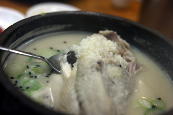 今年夏天的異常高溫,讓幾乎半個(gè)地球的人都難以忍受。該吃些什么來消暑呢?涼滋滋的雪糕?冷颼颼的冰飲?還是苦哈哈的綠豆湯?看看韓國人的另類祛暑秘方吧——熱乎乎的大補(bǔ)參雞湯! 參雞湯,顧名思義,就是有“人參”的“雞湯”,為韓國第一補(bǔ)湯。該湯制作講究,為達(dá)到嫩而不柴、香而不膩的效果,要選擇不大不小、一斤多的6周齡童子雞,將其充分洗凈后,在腹內(nèi)塞滿韓國高麗人參、黃芪、當(dāng)歸、枸杞、大棗、板栗、大蒜、糯米等數(shù)十種藥材,經(jīng)過數(shù)小時(shí)的精心燉制,湯汁變白變濃,出鍋時(shí)撒上香噴噴的蔥花、芝麻即成。一道雞湯,既有湯又有肉還有飯,清淡鮮美,滋補(bǔ)營養(yǎng),堪稱高效。 這道湯里最重要的部分——人參,在中國醫(yī)藥里,一般只適合于產(chǎn)后、術(shù)后氣血大虛之人?墒窃陧n國,人參是男女老少健病皆宜的食材,備受推崇,因此各種人參制品,如人參糖、人參糕點(diǎn)、人參茶、人參湯、人參酒、人參蜜等隨處可見。經(jīng)濟(jì)能力許可的老人還會每隔一段時(shí)間拿切成片的新鮮人參蘸著蜂蜜直接入口吃。盡管如此,大夏天的,將如此大補(bǔ)之物入口,還是令人詫異?身n國人卻認(rèn)為,正因?yàn)槭窍奶,人體因出汗多而消耗能量、營養(yǎng),吃了參雞湯,體內(nèi)積聚的廢物隨汗水排出,而讓人參雞這樣滋補(bǔ)的東西墊底,才有益身體健康。因此,每年入伏之后“參雞湯”就是韓國人必吃之補(bǔ)品。 據(jù)行家介紹,參雞湯所使用的是未經(jīng)加工的新鮮人參,俗稱水參,能起到“涼補(bǔ)”的作用。同時(shí),富含蛋白質(zhì)的雞肉有溫中益氣、補(bǔ)精添髓、補(bǔ)虛益智的作用。紅棗富含維生素,板栗富含氨基酸,能補(bǔ)腎補(bǔ)氣,糯米性味甘溫、入脾腎肺經(jīng),可益氣健脾、生津止汗。這些性質(zhì)溫和的輔料搭配在一起,經(jīng)過完美熬煮,融為一體,具有大補(bǔ)元?dú)狻⒐堂撋蛑π、適用于勞傷虛損、食少、倦怠、健忘、眩暈頭痛、陽痿、尿頻、氣血津液不足等癥,正好可以滿足夏季進(jìn)補(bǔ)的需要。 在韓國街頭,有不少參雞湯專營店,而位于首爾景福宮附近的“土俗村”是最有名的。這里一年四季都人滿為患,如今天已入伏,每天門口都排著長龍,不等上半個(gè)小時(shí)別想吃上令人心心念念的參雞湯。 近日,記者也懷著好奇之心,耐心等候了足足半個(gè)小時(shí),終于嘗到了這美味的大補(bǔ)湯。 一坐下,店家先送上一杯人參酒。這人參酒雖然只有一小杯(四錢左右),可是濃厚的參味讓人不得不慢慢品、慢慢抿。隨后,裝在瓦罐里的參雞湯上桌了。只見奶白色濃濃的雞湯里漂浮著點(diǎn)點(diǎn)的瓜子、芝麻和蔥花,整只小小的童子雞肉泛著淡淡的粉色,一看就引人食欲。 小心地下筷,夾起一些雞肉,長時(shí)間的燉煮早已將雞肉煮得酥爛無比,且充滿了藥材的清香。平素因嫌雞肉肉質(zhì)干硬而不愛吃的記者也吃得津津有味。掀開雞肚子,里面軟軟的糯米因浸透了雞湯,變得微黃,仿佛沾滿了鮮香的雞油,放進(jìn)嘴里入口即化。雞肚子里,還有小半根早已軟爛的山參。一口吃下,感覺自己一下子精力倍增。而最精華的部分,當(dāng)然就是那濃湯了。經(jīng)過幾個(gè)小時(shí)的燉煮,雞肉、人參、紅棗等的營養(yǎng)早已融入其中,加上該店獨(dú)特的秘方湯料,清淡的鮮美無與倫比,雞肉的鮮香、紅棗的甜香、人參的清香……和諧交融,簡直難以言說。 |