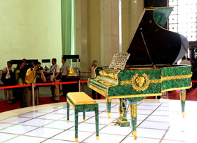 由民政部、中國社會工作協(xié)會等主辦的首屆“全國民間文化藝術(shù)精品上海公益博覽周”日前在上海展覽中心開幕。曾被美國流行音樂天王邁克爾·杰克遜珍藏的孔雀石鋼琴等500多件珍貴展品將在這里公開展出7天,并于7月31日進(jìn)行公益拍賣。 這架鋼琴被主辦方放置在展覽中心一層中央大廳的正中間位置。琴身主體材料為孔雀石,并用大量黃金、珠寶作裝飾,整琴重達(dá)639公斤,極為奢華。這架鋼琴有130多年的歷史,原為俄國皇室所有,后輾轉(zhuǎn)被多名世界樂壇名流收藏,其中就包括邁克爾·杰克遜。 據(jù)介紹,本次公益拍賣會共匯集了包括鉆石珠寶、名家畫作、名貴家具等在內(nèi)的500多件來自于民間的藝術(shù)精品,拍品總估價(jià)30多億元。主辦方將于7月31日在上海展覽中心舉行義拍,所籌善款全部用于革命老區(qū)貧困家庭兒童的助醫(yī)行動和青海省扶貧工程。