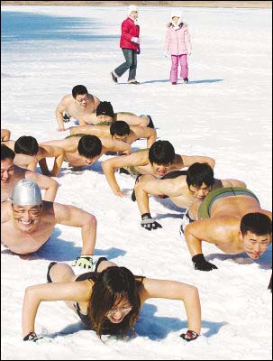 1月14日,冬泳愛好者在韓國首都首爾附近的雪地里熱身,準(zhǔn)備參加潛水比賽。當(dāng)日,選手們冒著零下9攝氏度的嚴(yán)寒,在首爾附近的漢江參加一年一度的冬季潛水比賽。