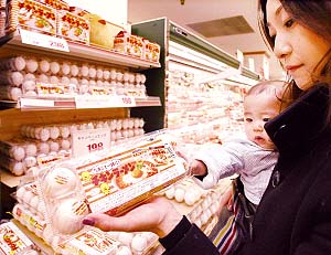 在日本東京,首批“廣告雞蛋”2月1日起在日本大榮超市連鎖店銷售,這批雞蛋的蛋殼上有日清食品公司的“雞湯拉面”廣告。圖為一名消費(fèi)者觀看有廣告的雞蛋。