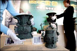 昨天(7日),由中國文物學(xué)會(huì)首次監(jiān)制的22種國寶級(jí)青銅器仿制品首次在皇城藝術(shù)館對(duì)外展示發(fā)售。我國文物法規(guī)定,作為文物的青銅器是禁止上市流通交易的。為了滿足收藏市場(chǎng)需求,中國文物學(xué)會(huì)精選了22件青銅仿品進(jìn)行監(jiān)制發(fā)行。發(fā)售的青銅器仿制品有被列為中國十大國寶青銅器的四羊方尊、龍虎尊,還有祈福和諧盛世的中華和尊,售價(jià)從500余元到數(shù)萬元不等,全部為絕版限量發(fā)售。