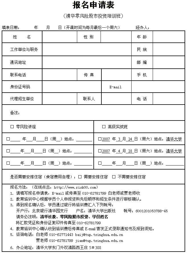 清華零風(fēng)險(xiǎn)股市投資培訓(xùn)班報(bào)名申請(qǐng)表