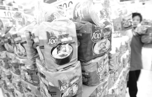 昨天,記者在新街口沃爾瑪超市看到,琳瑯滿目的方便面幾乎占滿超市整整兩大排貨架,有“康師傅”、“統(tǒng)一”、“五谷道場”等10多個品牌,同一品牌還包括不同品種、口味的產(chǎn)品。細數(shù)一下,僅“統(tǒng)一”旗下就有“好勁道”、“巧面館”、“統(tǒng)一100”等17種之多。 方便面種類繁多,價格差別也很大,如“統(tǒng)一”的“好勁道”系列,5袋一共4.6元,而“日清”的“出前一丁”系列,同樣是5袋連裝,卻是19元。一般來說,袋裝面0.8元到2元之間,桶裝面則是2.5元到4.5元不等。 方便面也十分好賣。短短1個小時,就有10多位市民在貨架前選購,很多市民一買就是好幾大包。 從在超市貨架所占的位置來看,小小方便面的“地位”卻不容小覷。記者走訪了幾家大型超市看到,沃爾瑪超市,方便面占滿兩排長約14米的6層貨架;金潤發(fā)鼓樓店,3排長約8米的8層貨架上全部擺放了方便面,其中桶裝面占據(jù)了1排貨架。同樣的情況也出現(xiàn)在蘇果、家樂福等其他超市。 據(jù)蘇果超市公司內(nèi)部人士透露,方便面之所以受到超市的歡迎,是因為其銷售量十分驚人!疤K果一年的方便面銷售額接近2億元,占到蘇果全年銷售額的3%,食品類銷售額的7%!痹撊耸窟說,其中桶裝面和袋裝面的銷售額比例在2:3左右。 如按袋裝面均價1元、桶裝面均價2.5元、銷售額比例2:3計算,一年僅南京市場上的方便面銷量就為1.67億袋(桶)。南京市人口約640萬,這樣算來,每位南京人一年的方便面消耗量約為26袋(桶)。