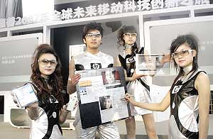 昨天(20日)下午,惠普在北京展示了9款未來(lái)移動(dòng)通信設(shè)備。據(jù)了解,北京是此次惠普“2007年全球未來(lái)移動(dòng)科技創(chuàng)新之旅”的第一站,今后該活動(dòng)還將在12個(gè)國(guó)家或地區(qū)的12個(gè)城市陸續(xù)舉行。圖為模特展示高科技未來(lái)移動(dòng)概念產(chǎn)品。