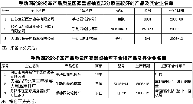 本次抽查依據(jù)國家標(biāo)準(zhǔn)GB/T13800-92《手動輪椅車》對手動四輪輪椅車產(chǎn)品的強(qiáng)度、性能、裝配、外觀等19項(xiàng)指標(biāo)進(jìn)行了檢驗(yàn)。抽查結(jié)果表明,以往抽查中問題突出的輪椅椅座耐沖擊強(qiáng)度差木座板斷裂、人造革面撕裂、十字支撐變形現(xiàn)象已逐漸減少。