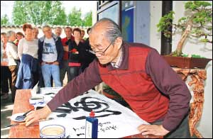 5月8日,中國菏澤牡丹節(jié)在法國巴黎近郊圣雷米?奧諾雷市的怡黎園開幕。中國傳統(tǒng)書畫、樂器展演以及精致的盆景藝術(shù)讓嘉賓們流連忘返。占地6000平方米的怡黎園是法國第一座中國傳統(tǒng)園林。圖為一位老人在表演中國書法。