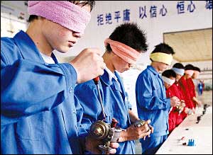 5月11日,幾名汽修專業(yè)應屆畢業(yè)生展示蒙眼拆裝分電器技能。當日,山東建設學院舉行首屆高級技工畢業(yè)生雙向選擇洽談會,500多名數(shù)控機床、汽修等專業(yè)應屆畢業(yè)生與用人單位簽訂協(xié)議。