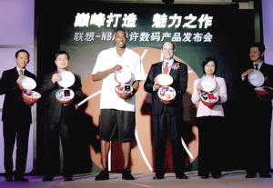 昨天(5日),NBA明星“魔獸”德懷特·霍華德(中)為聯(lián)想全新NBA電腦外設(shè)產(chǎn)品發(fā)布助威。