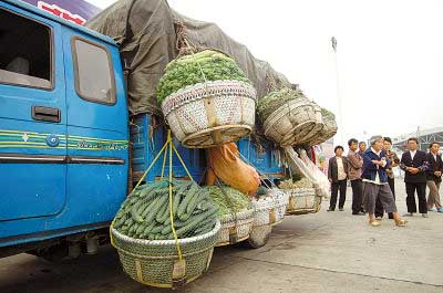 6月10日拍攝的被查處的農(nóng)用三輪車。當(dāng)日,一輛運(yùn)送蔬菜的農(nóng)用三輪車在通過(guò)安徽蕪湖長(zhǎng)江大橋時(shí),被交警查扣。該車狹小的車廂內(nèi)擠了18人,車外掛滿裝有蔬菜的大筐。