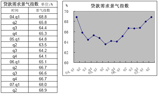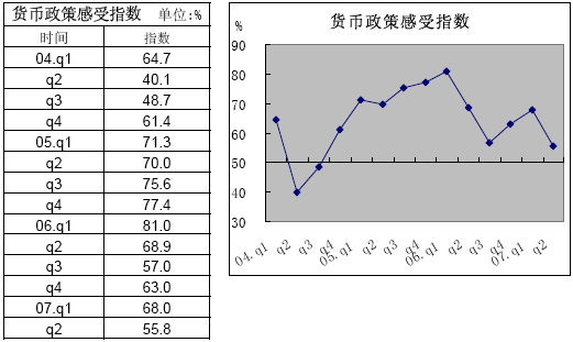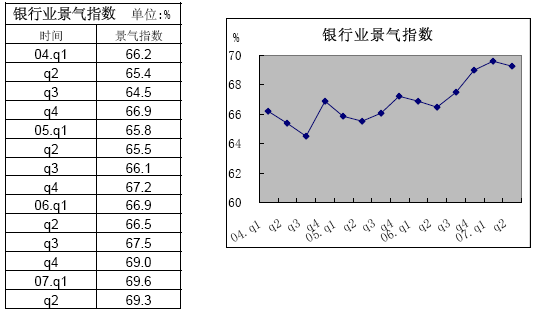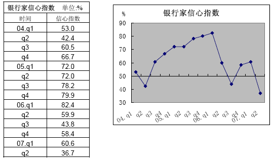 2007年第2季度,由中國(guó)人民銀行和國(guó)家統(tǒng)計(jì)局共同完成的全國(guó)銀行家問(wèn)卷調(diào)查顯示:銀行家信心指數(shù)降至歷史最低,對(duì)未來(lái)宏觀經(jīng)濟(jì)走勢(shì)預(yù)期不樂(lè)觀;銀行業(yè)景氣指數(shù)季節(jié)性回落,銀行財(cái)務(wù)狀況良好,盈利面擴(kuò)大,銀行業(yè)經(jīng)營(yíng)狀況良好。