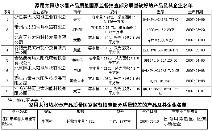 家用太陽熱水器是由太陽集熱器、貯熱水箱、管道及控制器等組成的節(jié)能產(chǎn)品,產(chǎn)品類型主要分為真空管型、平板型和悶曬型。據(jù)統(tǒng)計,2006年全國已有家用太陽熱水器生產(chǎn)企業(yè)五千多家,總產(chǎn)量達到2000萬平方米。 為維護消費者的合法權(quán)益,促進家用太陽熱水器行業(yè)健康發(fā)展,國家質(zhì)檢總局組織對家用太陽熱水器產(chǎn)品質(zhì)量進行了國家監(jiān)督抽查。共抽查了北京、河北、江蘇、浙江、安徽、山東、湖北、廣東等8個省、直轄市40家企業(yè)生產(chǎn)的40種產(chǎn)品(不涉及出口),產(chǎn)品抽樣合格率為82.5%。 此次抽查依據(jù)強制性國家標準GB4706.1-1998《家用和類似用途電器的安全第一部分