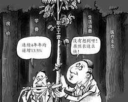 這也就意味著,制約公眾工資增長“感覺”的,不單是收入的絕對(duì)增長幅度,還有住房、養(yǎng)老、醫(yī)療、教育、保險(xiǎn)等公共產(chǎn)品的供給與保障。但事實(shí)上,目前這些供給卻難以讓人樂觀:房?jī)r(jià)居高不下甚至連年飛漲,看不起病、上不起學(xué)、買不起房的新“三座大山”壓得漫漫紅塵中的平頭百姓們喘不過氣來。在這種情況下,公共產(chǎn)品供給不足的這一短板,就在很大程度上折抵、消弭了工資增長帶給公眾的“喜悅”,從而讓多數(shù)人“沒感覺”。