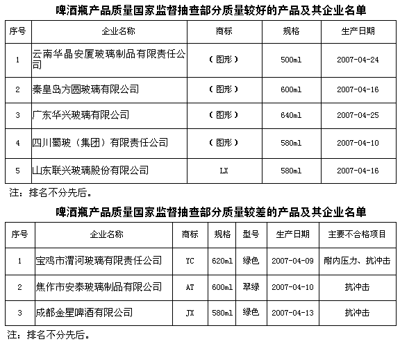 為維護廣大消費者的合法權益,促進啤酒瓶行業(yè)健康發(fā)展,國家質檢總局組織對啤酒瓶產(chǎn)品質量進行了國家監(jiān)督抽查。共抽查了河北、山西、吉林、黑龍江、上海、江蘇、浙江、安徽、福建、山東、河南、湖北、湖南、廣東、四川、重慶、云南、陜西、甘肅、寧夏、新疆等21個省、自治區(qū)、直轄市65家企業(yè)生產(chǎn)的65種產(chǎn)品(不涉及出口),產(chǎn)品抽樣合格率為86.2%。 此次抽查依據(jù)GB4544-1996《啤酒瓶》等國家標準進行檢驗,主要包括理化指標和標志指標。涉及的主要理化指標為:內應力、抗沖擊、耐內壓力和垂直軸偏差。標志指標主要是為防止不耐壓的非啤酒專用瓶用來灌裝啤酒,國家標準規(guī)定在瓶底以上20mm范圍打有啤酒瓶專用標記“B”和生產(chǎn)企業(yè)的標記,生產(chǎn)的年、季。經(jīng)檢驗,標志指標項目全部合格,部分產(chǎn)品理化指標中的抗沖擊和耐內壓力不合格。 抽查結果表明,一是連續(xù)的國家監(jiān)督抽查促進了企業(yè)質量意識的提高,加強了質量管理,使啤酒瓶產(chǎn)品質量水平比上次抽樣合格率提高了13.6個百分點;二是市場占有率較高的大中型企業(yè)產(chǎn)品質量較好,具有先進的生產(chǎn)工藝和嚴格的質量管理;三是部分小型生產(chǎn)企業(yè)的產(chǎn)品質量問題較多。 抽查中發(fā)現(xiàn)的主要質量問題: 1、部分啤酒瓶抗沖擊力能力達不到國家標準規(guī)定的要求,抗沖擊力能力差的啤酒瓶在罐裝啤酒后,受到某種外力作用時,可能會發(fā)生啤酒瓶爆炸。 2、部分啤酒瓶耐內壓力達不到國家標準規(guī)定的要求。耐內壓力差的啤酒瓶在盛裝啤酒后,在生產(chǎn)、運輸和使用過程中,會因輕微碰撞而引起爆炸,也有可能發(fā)生自爆。