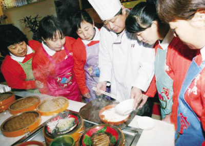 據(jù)民政部門家政服務(wù)中心介紹,今年“金豬寶寶”扎堆,月嫂吃香,而寶寶家庭對月嫂業(yè)務(wù)能力要求普遍提高,不僅要求能干,還要求技術(shù)科學,例如最基本的做飯,家庭除要求可口之外,更多提出要保證營養(yǎng)。圖為月嫂在專業(yè)蒸菜大廚的指導下學習蒸菜烹飪。 |