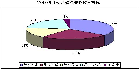 全行業(yè)虧損面有所縮小,1-5月虧損企業(yè)個數(shù)同比增長4.8%,比1-2月增幅下降1個百分點;虧損企業(yè)虧損額145億元,比1-2月下降1.8個百分點,其中國有控股企業(yè)表現(xiàn)較好,虧損額同比下降24.3個百分點。分經(jīng)濟類型看,內(nèi)資企業(yè)累計虧損34.2億元,同比下降20個百分點;三資企業(yè)累計虧損110.4億元,比去年增虧21.4億元。 3.高端產(chǎn)品發(fā)展較快,傳統(tǒng)家電產(chǎn)品有所萎縮。從我部重點監(jiān)測產(chǎn)品情況看,移動通信手機、液晶電視、筆記本電腦、液晶顯示器等產(chǎn)品連續(xù)幾個月保持30%以上增速。1-5月全行業(yè)共生產(chǎn)手機22598.9萬部,同比增長33.7%;筆記本電腦產(chǎn)量比重不斷提高,全行業(yè)共生產(chǎn)微型計算機4875.3萬部,其中筆記本3055.5萬部,占微機比重為63%,比去年提高3個百分點;高端彩電產(chǎn)品發(fā)展迅速,特別是液晶電視共生產(chǎn)486.6萬臺,同比增長66.2%,占彩電的比重達到17%,比去年同期提高7個百分點,比上月提高2個百分點。傳統(tǒng)家電產(chǎn)品呈負增長態(tài)勢,電話單機生產(chǎn)量同比下降8%;傳真機同比下降26.8%。集成電路增速有所放緩,1-5月共生產(chǎn)155.5億塊,同比增長12.5%,較上年同期增速下降37.1個百分點。 4.軟件業(yè)繼續(xù)保持平穩(wěn)發(fā)展,內(nèi)部結(jié)構(gòu)調(diào)整進一步深化。1-5月軟件業(yè)實現(xiàn)收入1846.0億元,同比增長27.0%,占電子信息產(chǎn)業(yè)比重仍然保持在10%以上。從其內(nèi)部構(gòu)成看,軟件服務(wù)業(yè)繼續(xù)保持較快發(fā)展水平,高出軟件業(yè)平均增速10個百分點;IC設(shè)計收入增速較年初有所放緩,但仍高出平均增速水平。1-5月軟件產(chǎn)品實現(xiàn)收入658.8億元,同比增長26.2%;系統(tǒng)集成456.5億元,同比增長25.8%;軟件技術(shù)服務(wù)303.1億元,同比增長37.0%;嵌入式系統(tǒng)軟件收入380.0億元,同比增長20.0%;IC設(shè)計收入47.6億元,同比增長33.3%,上述五大類業(yè)務(wù)收入構(gòu)成36:25:16:20:3個格局,與1-2月份的39:27:17:15:2的格局有所調(diào)整。